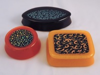 This oval box is cast in the palest amber and trimmed with smaller castings in the same shade. It is reminiscent of rustic Orna Wood boxes sold at national park gift stores in the 50’s.